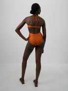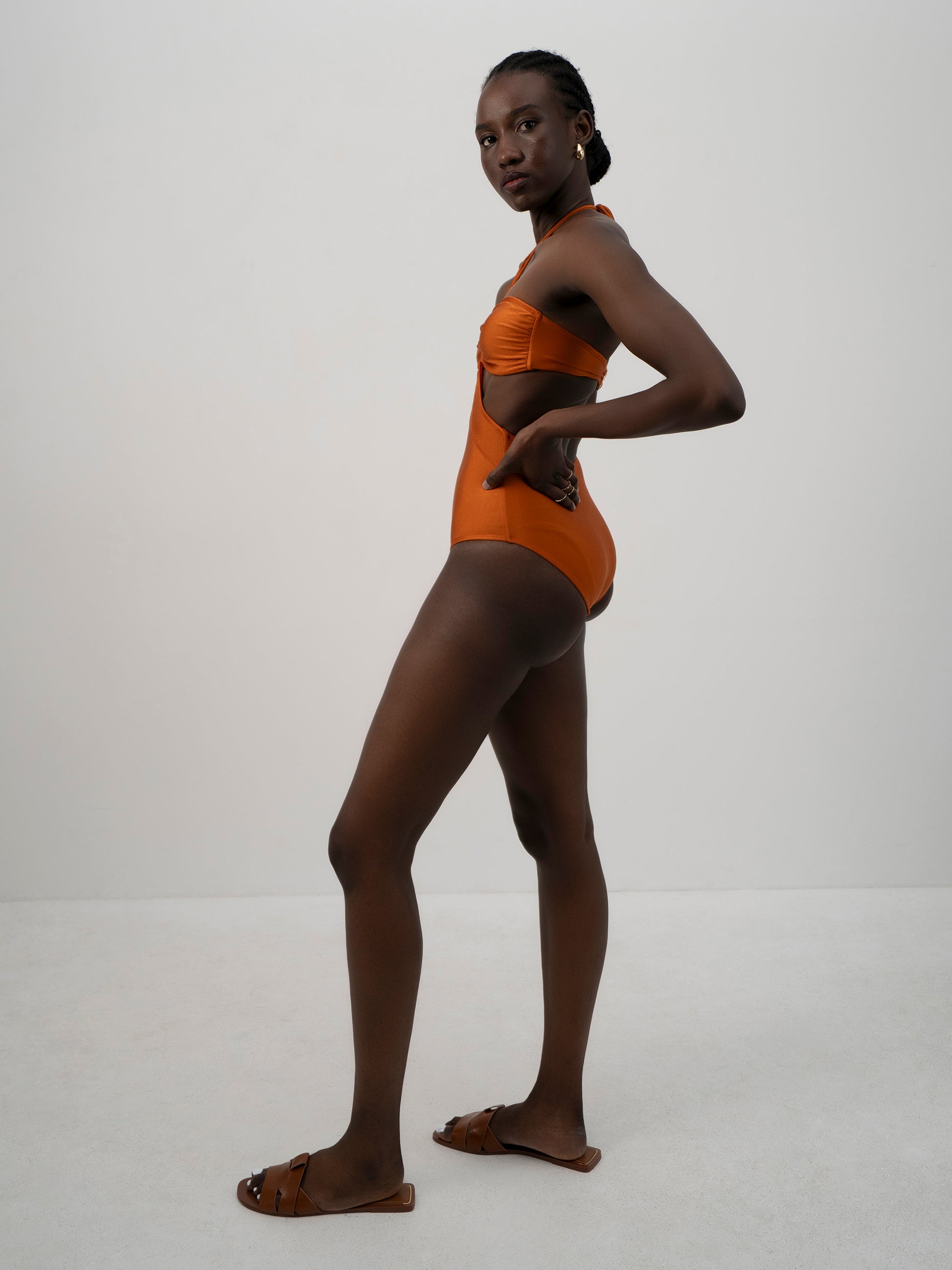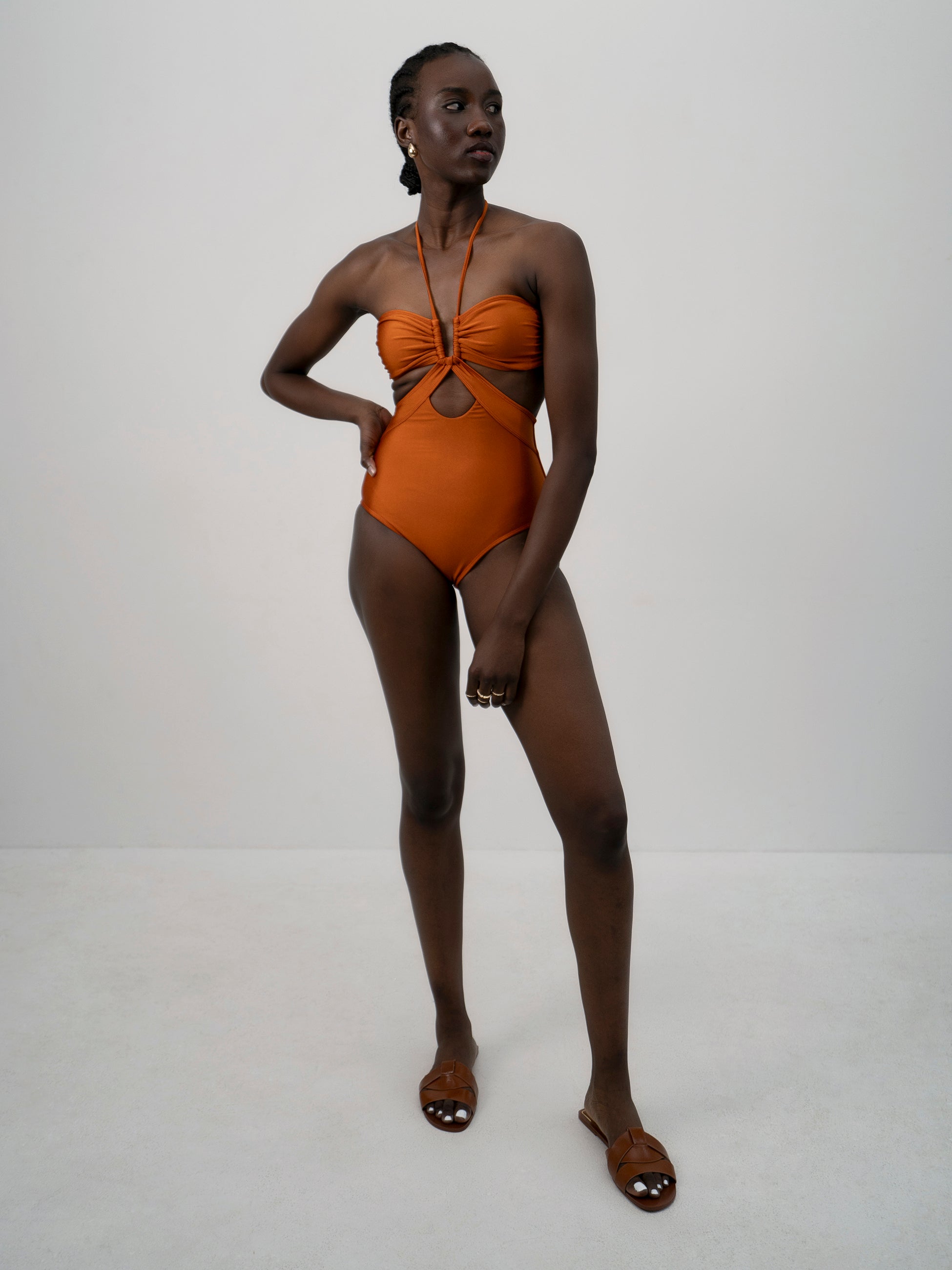Elevate your swimwear with THE LINGERING FEELING ONE-PIECE, a masterpiece of design that marries sleek style with a touch of glamour. Dressed in a shimmery BRONZE colour, this cut-out one-piece boasts a self-covered square-shaped U-wire and ruched Centre Front, enhancing the bust with elegance. Removable cups and a versatile neck tie adorned with gold beads offer personalized fit and styling options. The oval keyhole feature at the Centre Front and gathered supportive bands add sophisticated details, while the gold back clip and low back waist design ensure a secure and flattering silhouette.