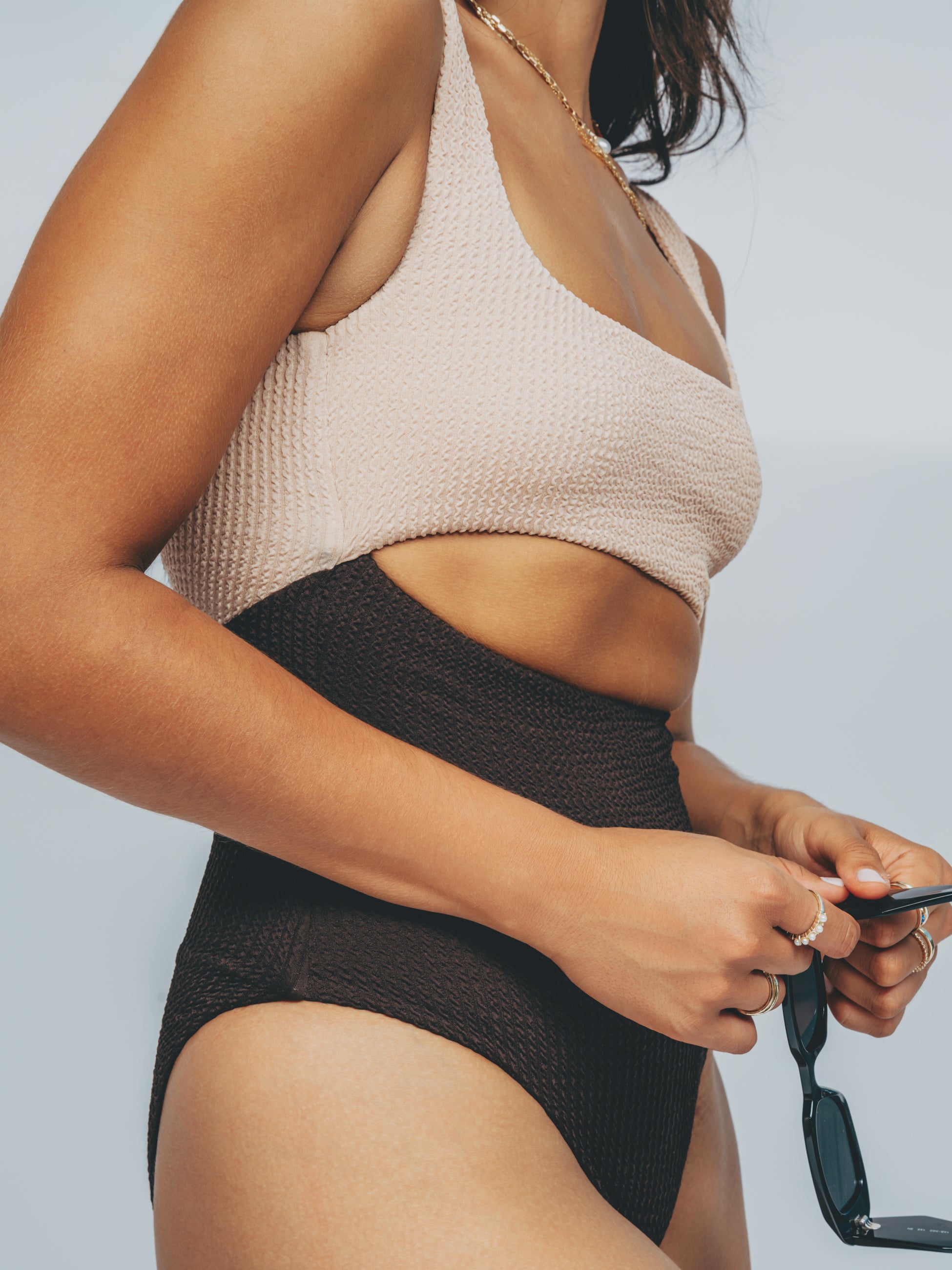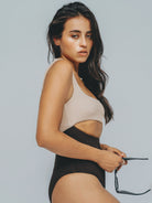 Made from body-contouring crinkle fabric, this one-piece offers a sculptural fit that flatters with intention. Its square-shaped neckline and low scoop back frame the torso beautifully, while the midriff cut-out and seamless finish enhance comfort and fluidity of movement.