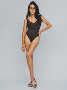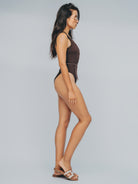 This chocolate-hued one-piece features a soft crinkle fabric that moulds gently to your form, enhanced by an internal power mesh full-front panel that offers subtle shaping through the waist and tummy. Discreet under-bust reinforcement and removable cups provide customisable support, while the faux wrap front and gentle gathers sculpt a silhouette that feels refined yet relaxed.