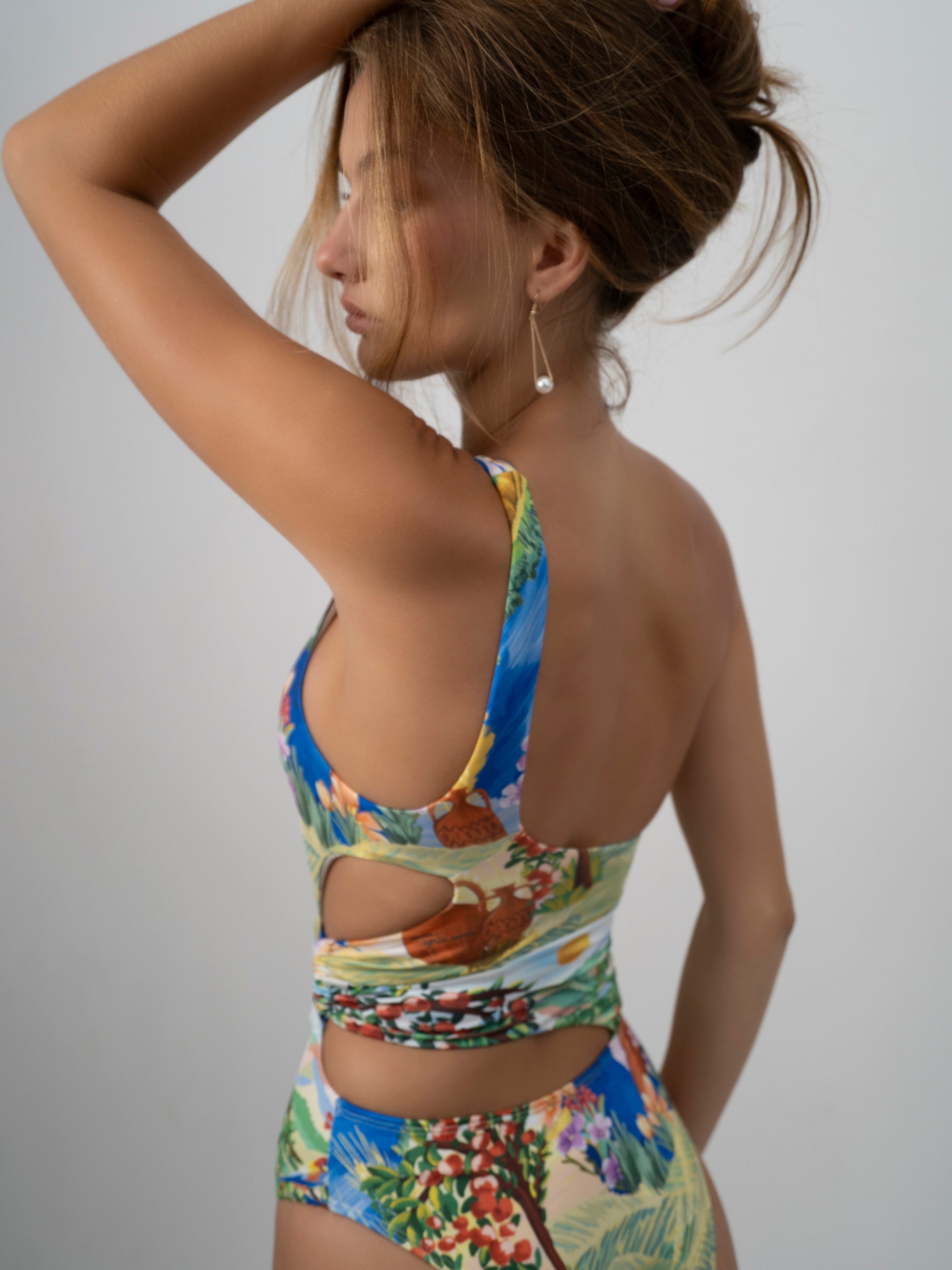 Capture the essence of summer with the MY BELOVED ONE-PIECE, a cut-out one shoulder one-piece swimsuit that celebrates the vibrant Circle of Life textile print in a stunning asymmetrical design. This softly draped piece accentuates the midriff with elegant cut-out lines, and an oceanic blue colour covered ring adds a striking contrast. Designed for an elongated look with a high-cut leg line and medium back coverage, this one-piece is fully lined for comfort and showcases the placement print at the front neckline for a touch of artistry.