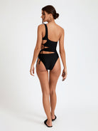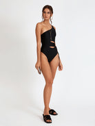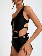Exclusively from our Inherent Beauty collection, the WILLOW ONE SHOULDER ONE-PIECE is asymmetrical, softly draped garment that accentuates the narrowest part of the midriff with carefully placed cut-out design lines. Soft elasticated rouleau tie is threaded through the side body panels and ties at the back for adjustable fit. It has seamless front finish and high-cut leg line for elongated look.