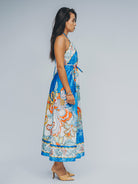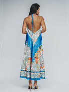 Cut from a single panel of flowing silk, this voluminous beauty is as soft on the skin as it is dramatic in presence. The halter neckline and open back offer sensual elegance, while the removable corded belt—with antique gold-beaded tips—lets you shape the dress to suit your moment, your mood, your movement.