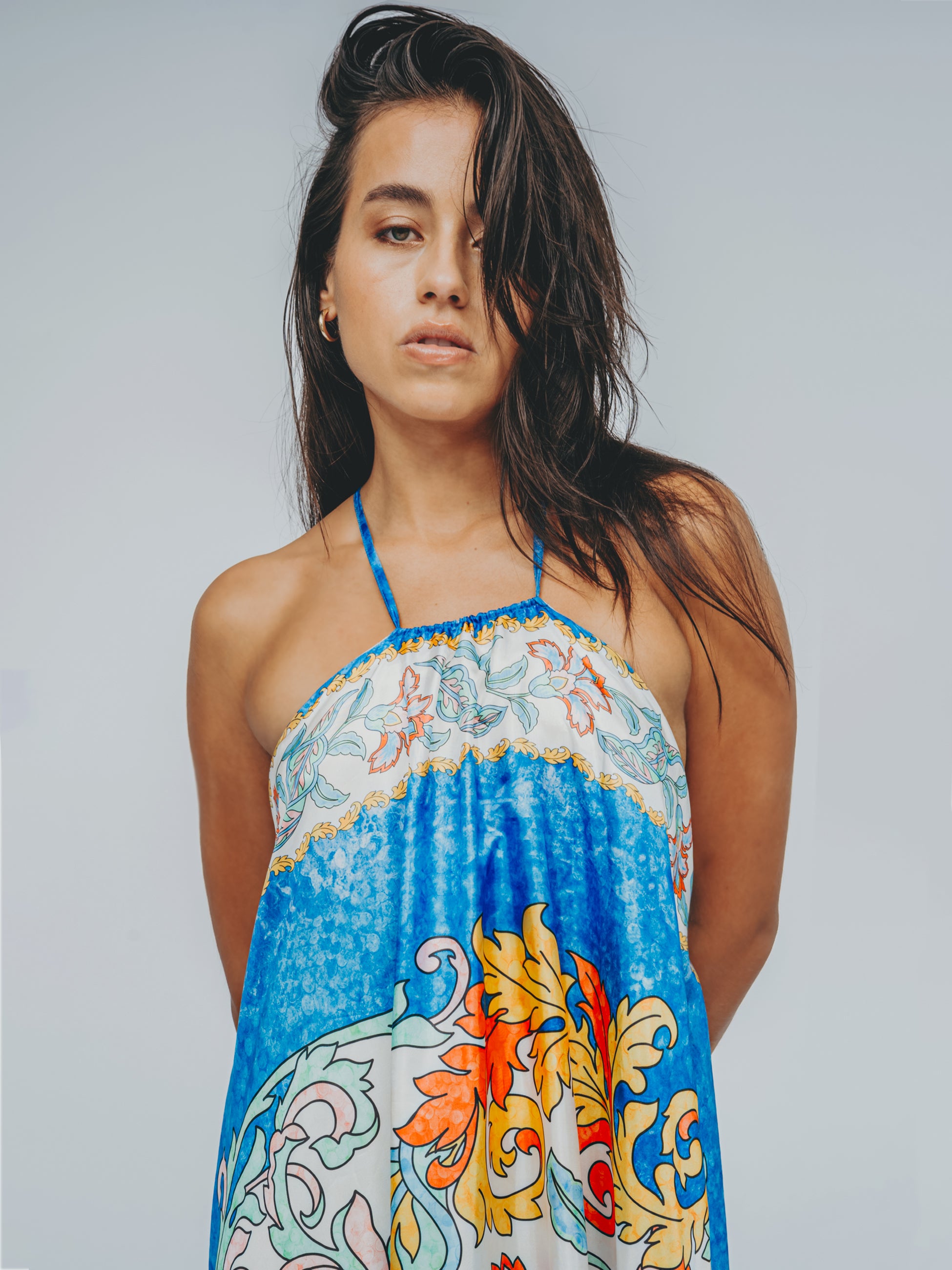 Wear it belted or free, tied at the neck or with the cross-over back straps—each style tells a different story, all your own.
