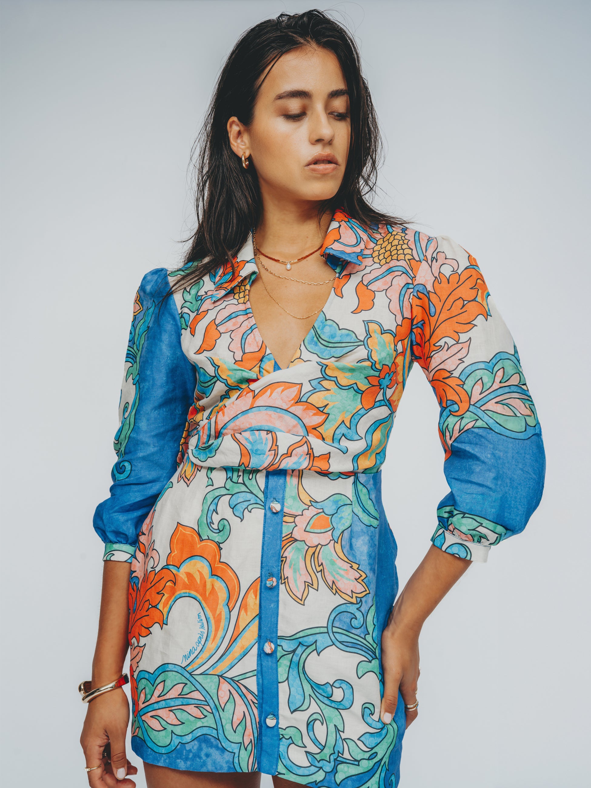 The ORNATE MINI DRESS is where tailored elegance meets carefree spirit. Crafted from premium 100% linen and adorned with Nina Après Swim’s exclusive ornamental placement print, this dress celebrates both form and artistry in one stunning silhouette.