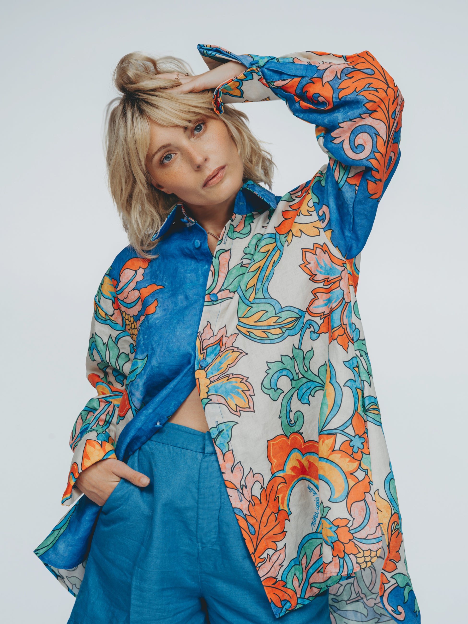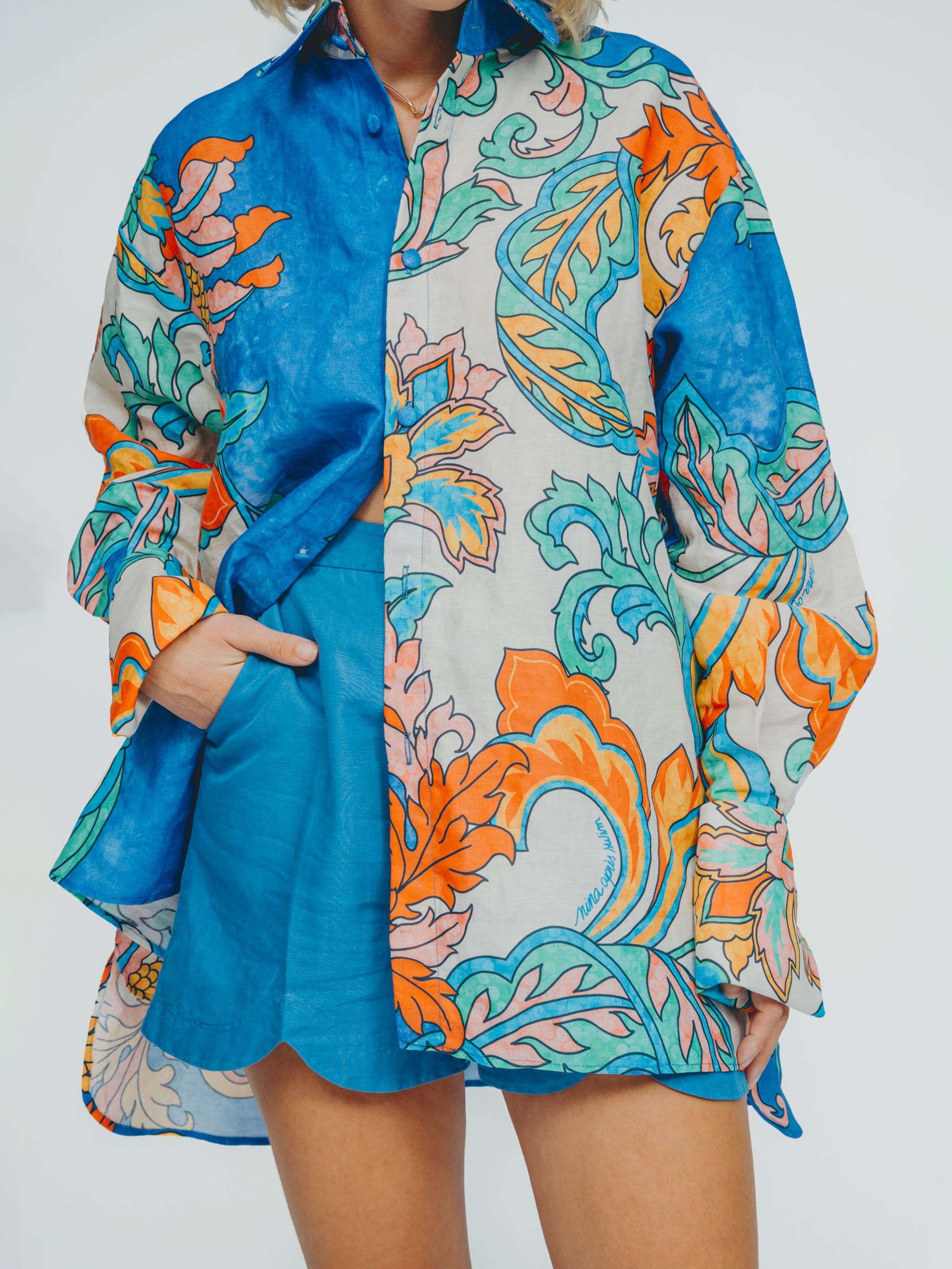 Elevate your wardrobe with the ORNATE OVERSIZED SHIRT, a must-have in women’s designer resort-wear. Created from 100% breathable linen and adorned with Nina Après Swim’s exclusive artisan ornamental print, this statement piece embodies relaxed sophistication and sustainable fashion values.