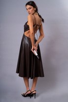 The DAPHNI Open-back Dress is a stunning vegan leather dress from the Hidden Heritage collection. Made from post-consumer recycled materials in a rich, dark Coffee colorway, this demi-luxury full-skirted dress features an open-back design with cut-out sides. It has a flattering curved waistline, a thigh-high split on one side, paired with a pleated and gathered front that adds emphasis to the neckline. The Daphni Open-back Dress has an invisible zip at the side, and drawstring ties that can be adjusted to ensure the dress are always well-fitting.