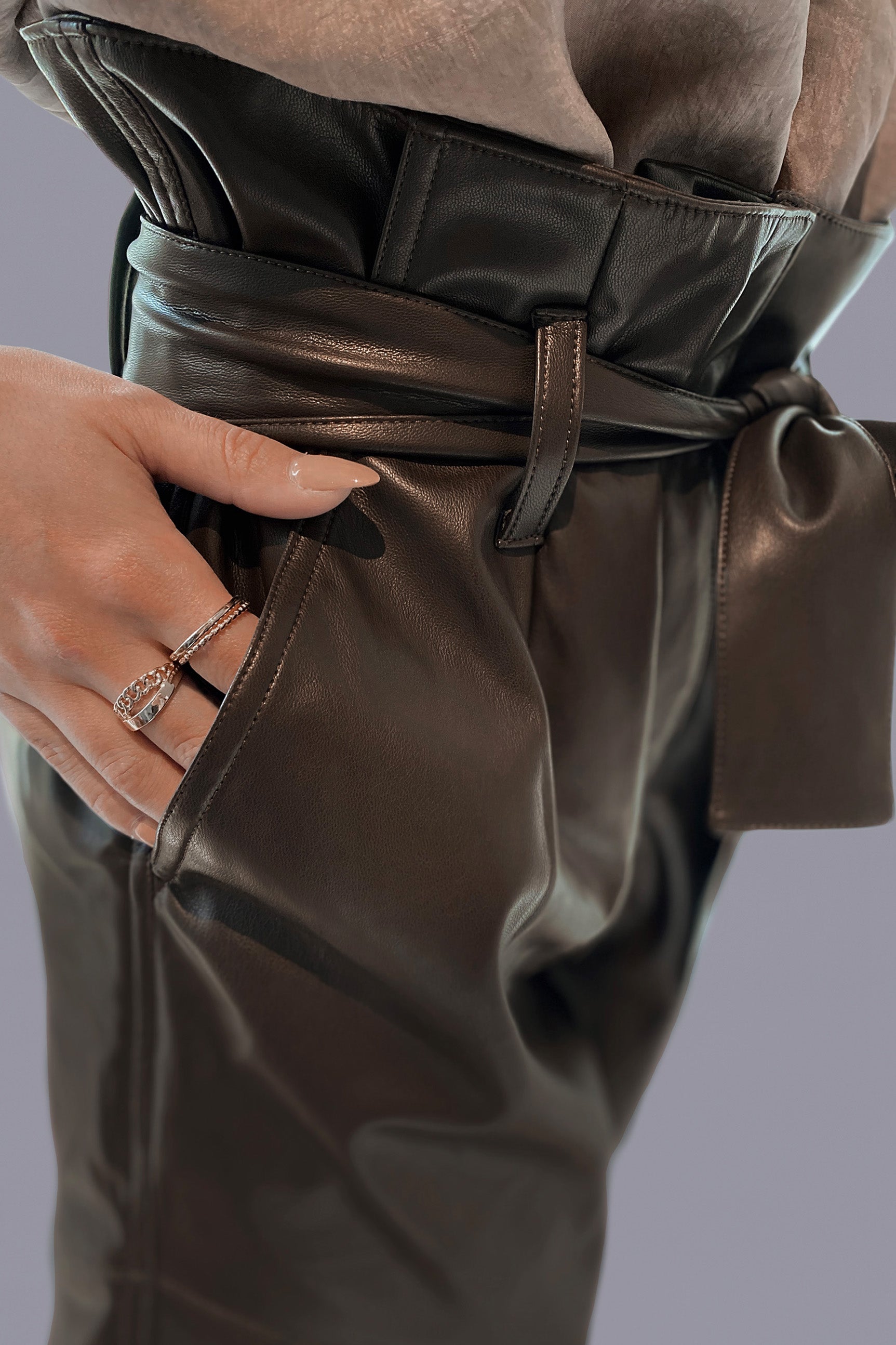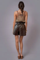 The NEA Paper Bag Waist Shorts are an eclectic and environmentally conscious garment from the Hidden Heritage collection. Made from soft and supple vegan leather in a rich, dark Coffee colourway, these gorgeous high-waisted shorts feature a cinched 'paper bag waist' design. The NEA Paper Bag Waist Shorts have two convenient side pockets, a belted waist and an elasticised back that provides a relaxed and comfortable fit.