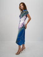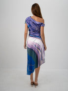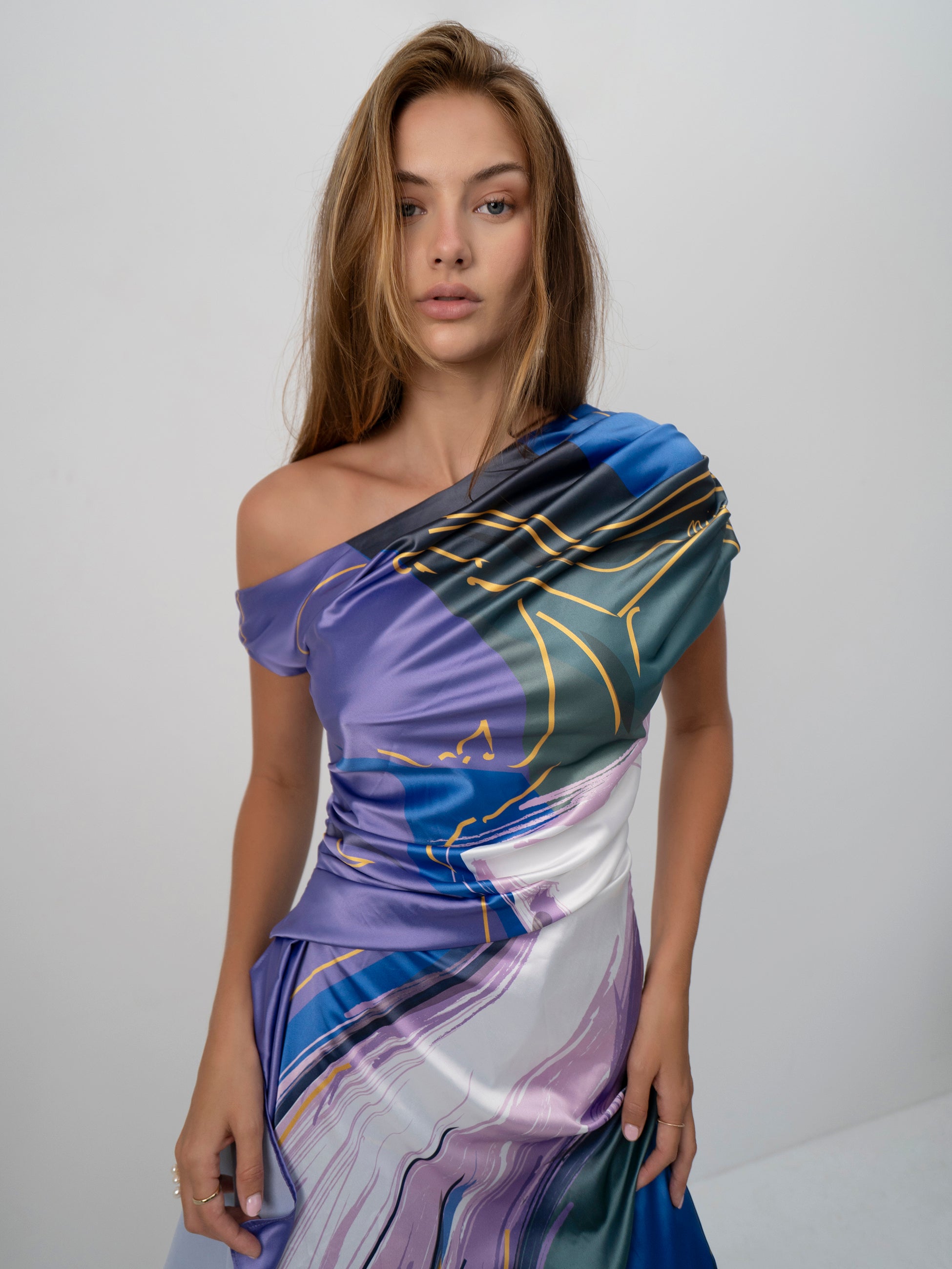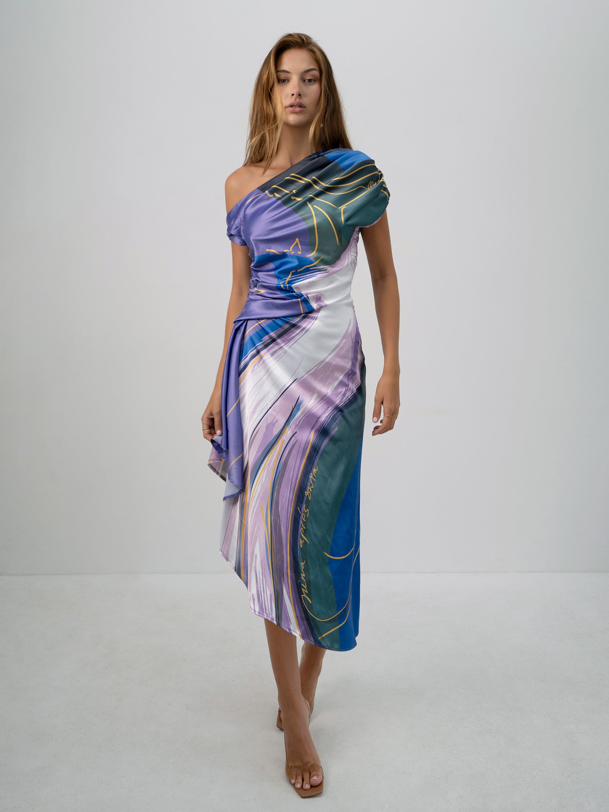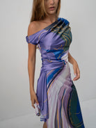 THE ICON DRESS from The Hand That Makes collection, is an asymmetrical, flowy creation, crafted from 100% silk fabric. The dress features our exclusive She Awaits textile print, enhancing its draped features with an artistic touch. The off-shoulder design on the left side, and waterfall hem add layers of refinement and fluidity to the silhouette, making it a standout piece for any wardrobe. Ideal for those who covet luxury and unique design in their fashion choices.